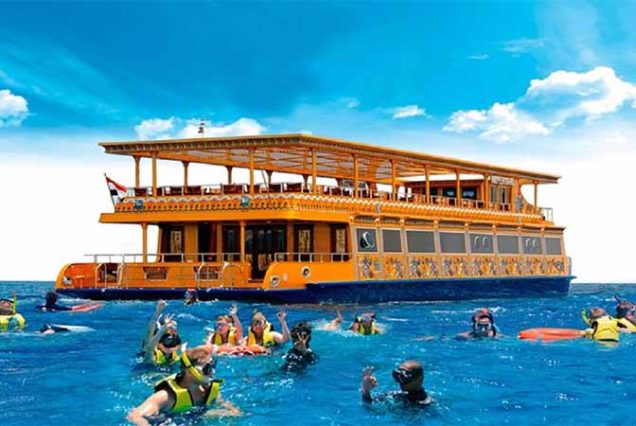 Sunset Trip (02:00 PM – 07:00 PM): Begin your journey in the afternoon and watch the magic of the Red Sea sunset from the elegant Pharaonic Boat. Explore the underwater world from the submarine deck, capture stunning souvenir photos, enjoy snorkeling, and end the day with a delicious seafood dinner served onboard in a joyful atmosphere.